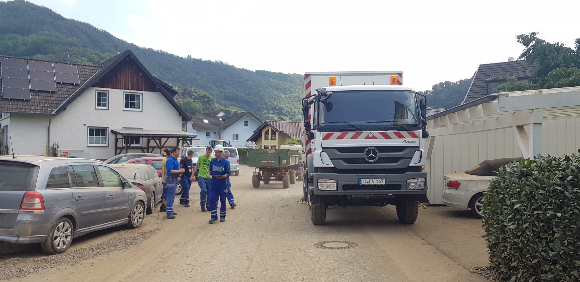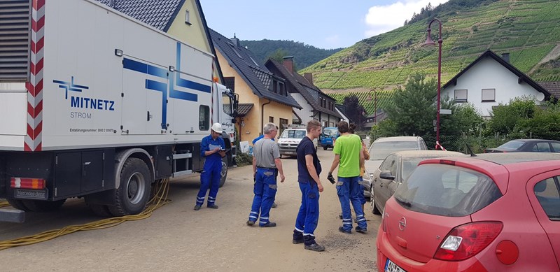 Kurz darauf sind dutzende weitere MITNETZ-Mitarbeiter mit ihren Einsatzfahrzeugen, Netzersatzanlagen und Material in die Flutregion gefahren. Ziel war die Unterstützung bei der schnellstmöglichen Herstellung der elektrischen Infrastruktur in Zusammenarbeit mit den WESTNETZ-Mitarbeitern vor Ort.