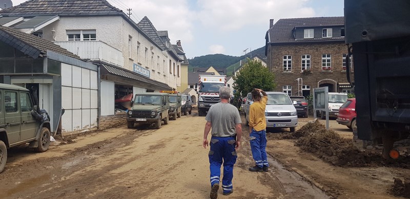 Rund 30 MITNETZ-Netzkollegen sind aktuell im Aar-Tal in der Eifel eingesetzt, konkret in Dernau. Der Großteil der Kollegen ist seit letztem Sonntag vor Ort. Anfang der Woche wurden weitere MITNETZ-Kollegen nachgeschickt. Vor Ort übernachten sie im Basislager der WESTNETZ, einem Bildungszentrum in Wanderath. Unsere entsendeten Mitarbeiter arbeiten mit den WESTNETZ Kollegen eng zusammen.