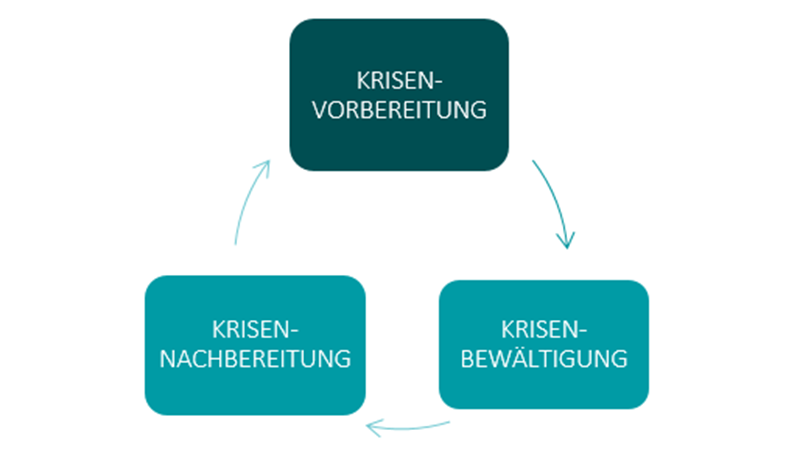 Im Wesentlichen durchläuft das Krisenmanagement drei Phasen: Krisenvorbereitung, Krisenbewältigung und Krisennachbereitung.