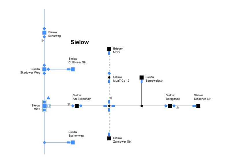 Beispiel: Ausschnitt einer Fehlersuche am Beispiel einer Störung in der Ortschaft Sielow. Nach Kontrolle der Trafostation Sielow-Mitte wurde durch den Monteur festgestellt, dass im 20 kV-Abgang Sielow-Mitte der Leistungsschalter ausgelöst hat. Dadurch waren sechs Mittelspanunnungsstationen spannungslos.