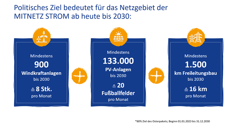 Übersetzt auf das Netzgebiet der MITNETZ STROM bedeutet das konkret: 8 zusätzliche Windkraftanlagen, 20 Fußballfelder mit zusätzlichen Photovoltaik-Anlagen und 16 km neue Freileitungen. Und zwar pro Monat! Dies in einem Netzgebiet, dass im Bundesvergleich bereits einen sehr hohen Anteil an Erneuerbaren Energien zu bewältigen hat. Dazu kommen die aktuellen makroökonomischen Herausforderungen mit Fachkräftemangel, steigenden Zinsen, galoppierender Inflation und hohen Energiepreisen.