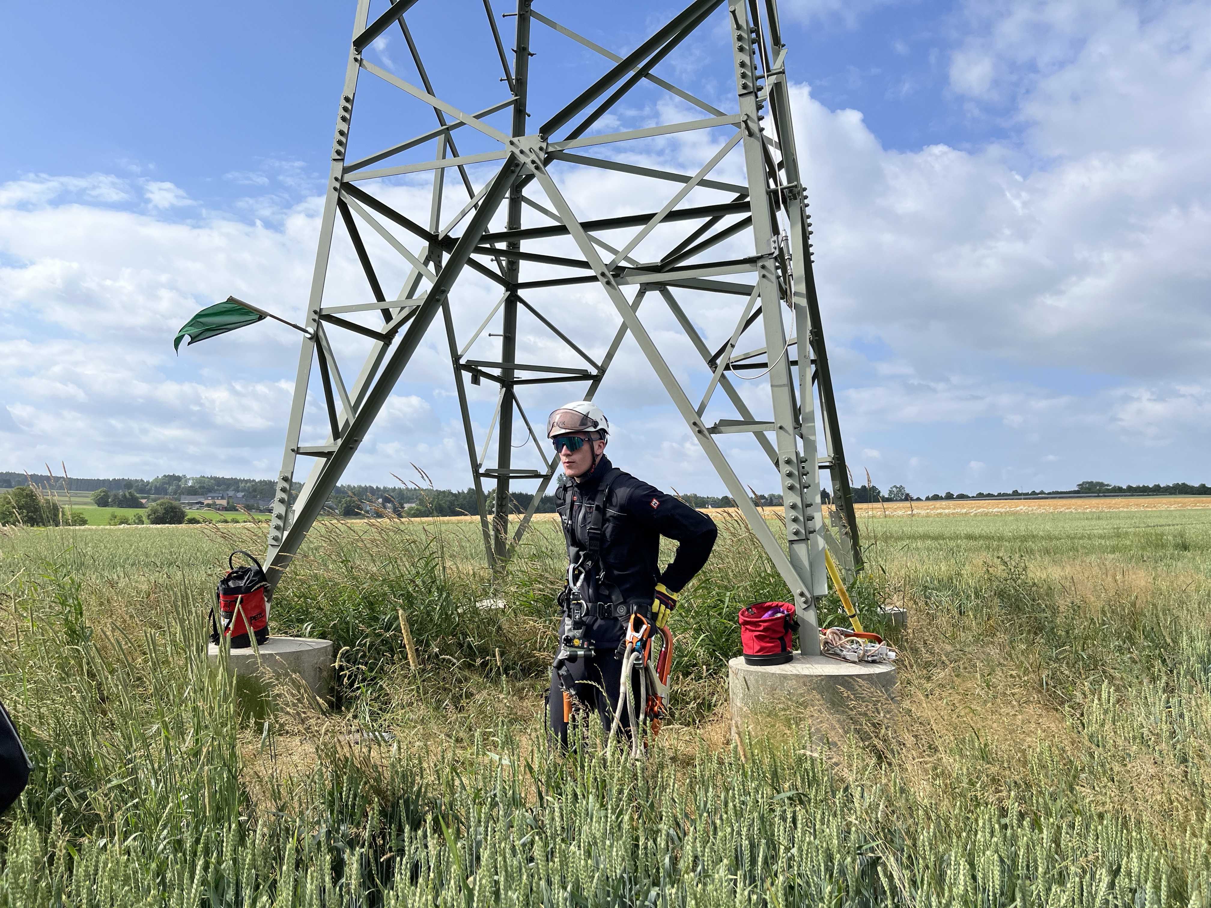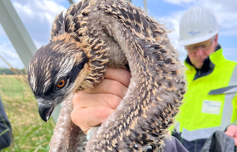 Doch wie kommt man an einen Fischadler heran, der mitten auf einem 110-Kilovolt-Freileitungsmast wohnt und trotz seines zarten Alters bereits massive Krallen und einen scharfen Schnabel trägt? Die Bergung des Fischadler-Kükens aus dem Nest auf dem Hochspannungsmast war eine herausfordernde und nicht ganz alltägliche Aufgabe, die von den Spezialmonteuren Richard Büchner und Eric Ritter von MITNETZ STROM bravourös gemeistert wurde.