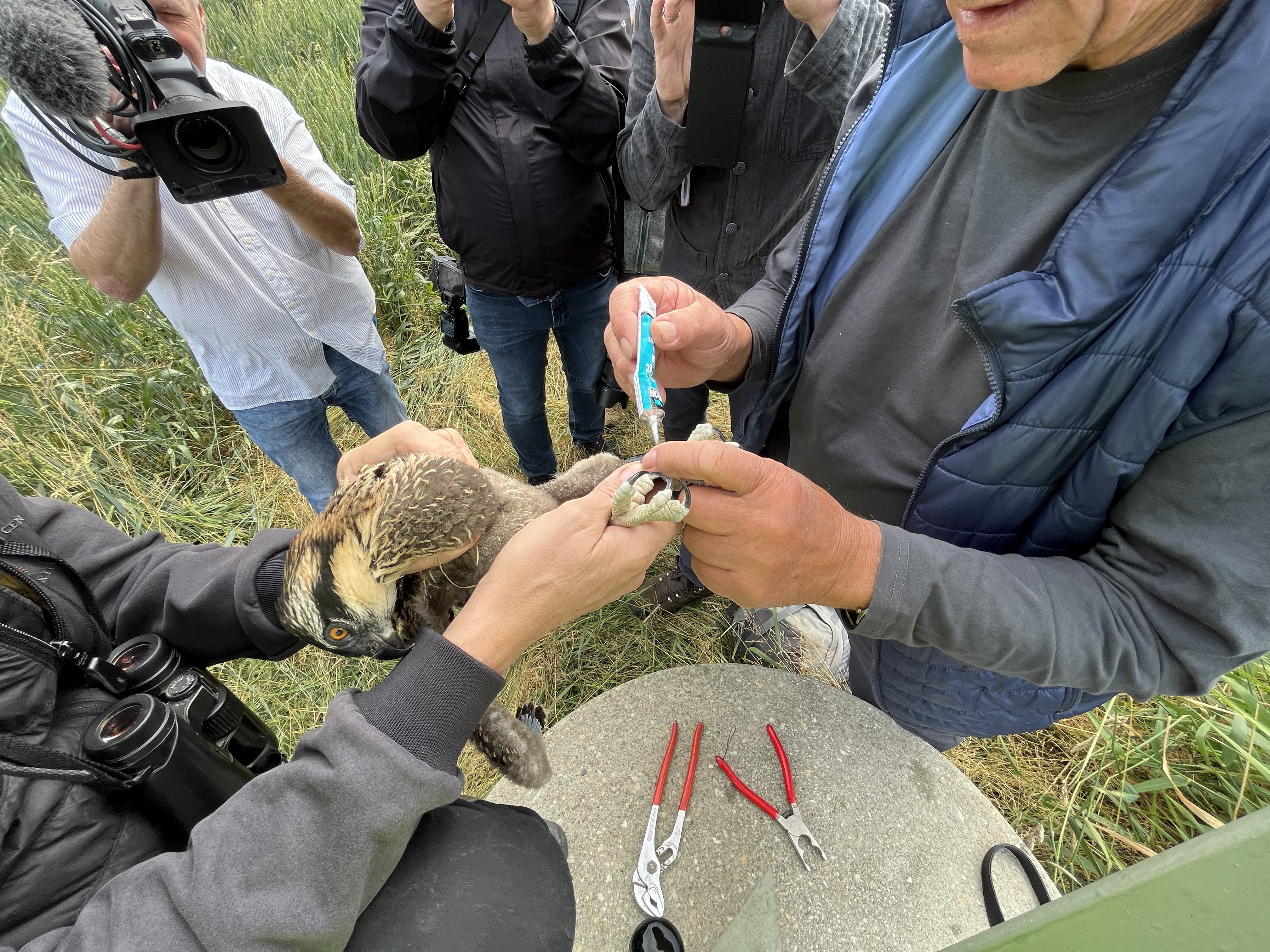 Die Beringung des Fischadler-Kükens wurde von den Ornithologen Dieter Kronbach und Jens Hering – letztgenannter arbeitet bei der Unteren Naturschutzbehörde des Landkreises Zwickau – vorgenommen. Für Ruheständler Dieter Kronbach, der wie Jens Hering auch für die Vogelwarte Hiddensee tätig ist, ein ganz besonderer Moment, denn einen Fischadler hatte noch nie beringt. Premiere also! Entsprechend groß war auch das Aufgebot der Medienvertreter mitten auf dem Weizenfeld.