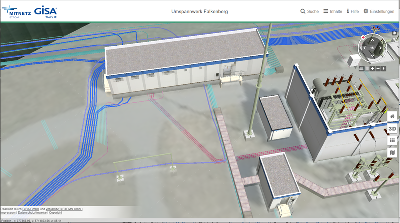 Inzwischen sind die Außenanlagen des Umspannwerks Falkenberg als vollständiges 3D-Modell vorhanden. Es lässt sich am Computer aus jeder Perspektive betrachten und sehr realitätsnah virtuell „begehen“. Dabei sind alle wesentlichen Details vorhanden, sogar Dächer können aufgeklappt werden. Notwendige Sachinformationen zu den vorhandenen Betriebsmitteln sind im direkten Zugriff abrufbar. MITNETZ STROM konnte dabei auf eigene Daten zurückgreifen, musste aber auch zahlreiche Informationen neu erfassen und mit öffentlichen Quellen ergänzen.