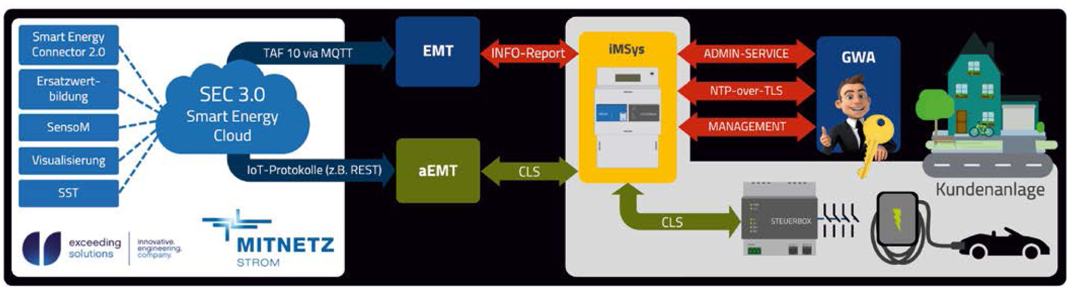 Die per CLS-Schnittstelle angebundenen technischen Ressourcen, wie etwa Wärmepumpen, Ladestationen oder auch Erzeugungseinheiten wie Photovoltaikanlagen werden dabei für Akteure der Energiewirtschaft sichtbar. „Durch Integration der entsprechenden Kommunikationsprotokolle können nahezu alle steuerbaren Geräte über das Smart-Meter-Gateway (SMGW) an den aEMT angebunden werden. Die Erfahrung bezüglich der notwendigen Softwarebausteine wurden bereits während zahlreicher Forschungs- und Pilotprojekte gesammelt“, erzählt Niklas Rack, Bereichsleiter Entwicklung bei exceeding solutions. Dabei spielt das CLS-Management eine wichtige Rolle, indem es die aufgebauten Kanäle zum SMGW überwacht und auch terminiert, sobald die Steuerung nicht mehr notwendig ist.