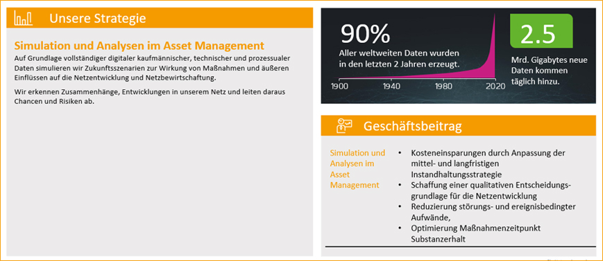 Die MITNETZ STROM und MITNETZ GAS besitzt einen enormen Datenschatz. Mithilfe dieser Daten simulieren wir Zukunftsszenarien zu der Fragestellung: Wie wirken sich bestimmte Maßnahmen oder äußere Einflüsse auf die Netzentwicklung und -bewirtschaftung aus? So erkennen wir bestimmte Zusammenhänge in unserem Netz und leiten daraus Chancen und Risiken ab.