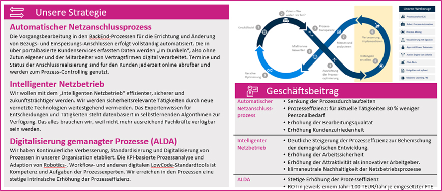 Wir wollen zum Beispiel den Netzanschlussprozess, also die Errichtung und Änderung von Bezugs- und Einspeisungs-Anschlüssen vollständig automatisieren. Die über Kundenportale eingespeisten Daten werden vollständig automatisiert digital verarbeitet. Der Kunde kann Termine und Status der Umsetzung seines Anschlusses jederzeit online abrufen. Wir nutzen die Informationen auch zum eigenen Prozess-Controlling.