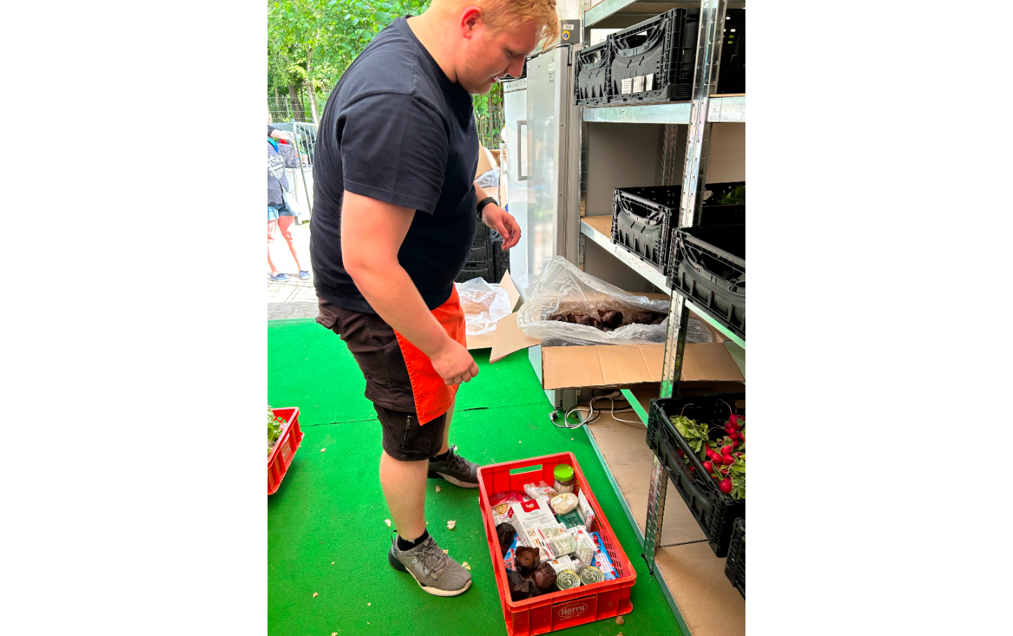 Hannes Barth, Auszubildender für Mechatronik und Mitglied der JAV: „Unser erster Einsatztag begann am frühen Morgen des 24. Juni mit dem Auspacken von Spenden und dem Sortieren von Lebensmitteln. Danach halfen wir im Lebensmittelzelt, wo Kisten zusammengestellt und an Bedürftige ausgegeben wurden. Besonderen Wert legt die Tafel darauf, dass die Kunden ihre Lebensmittel selbst auswählen können. Zusätzlich konnten Spielwaren und seltene Lebensmittel gegen einen kleinen Betrag erworben werden.“